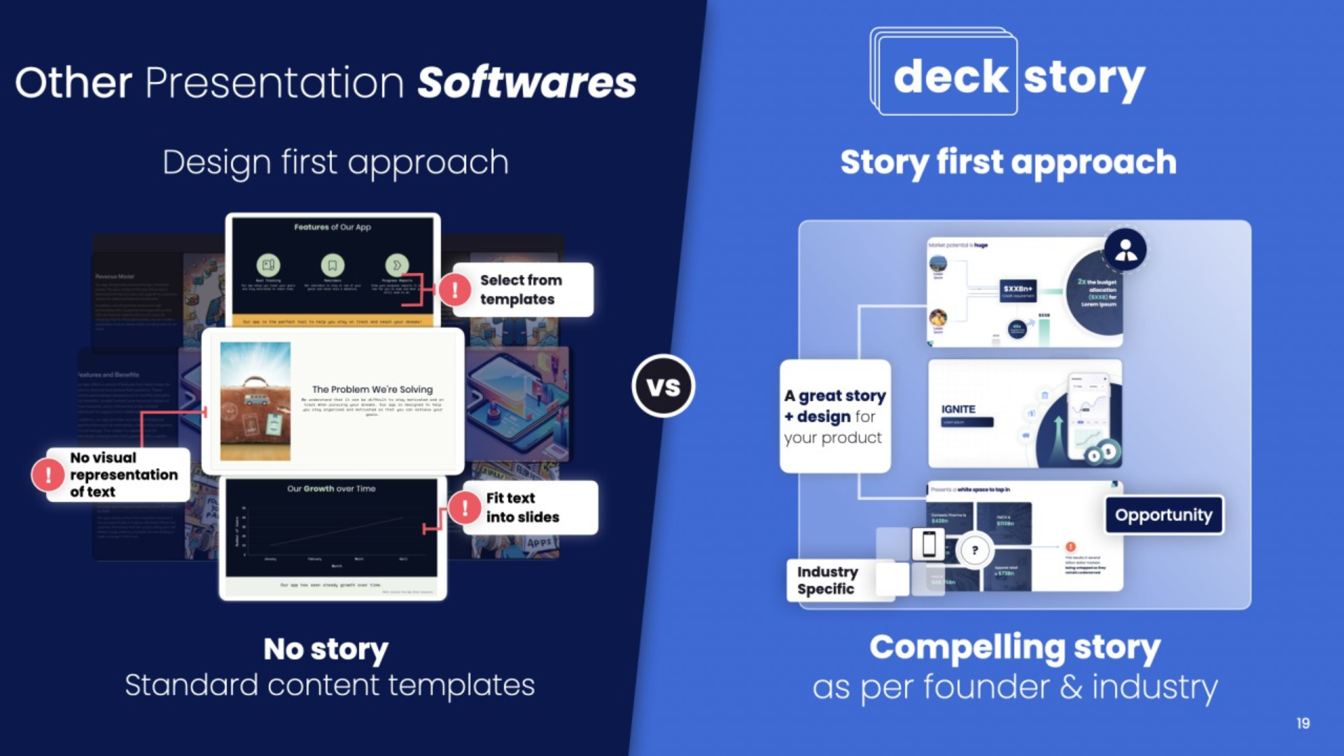 Deckstory is to founders and pitch deck creators what canva is to designers. It helps you create a great narrative, compelling content and kickass design. Unlike Canva and other Al tools, it is more than just design.